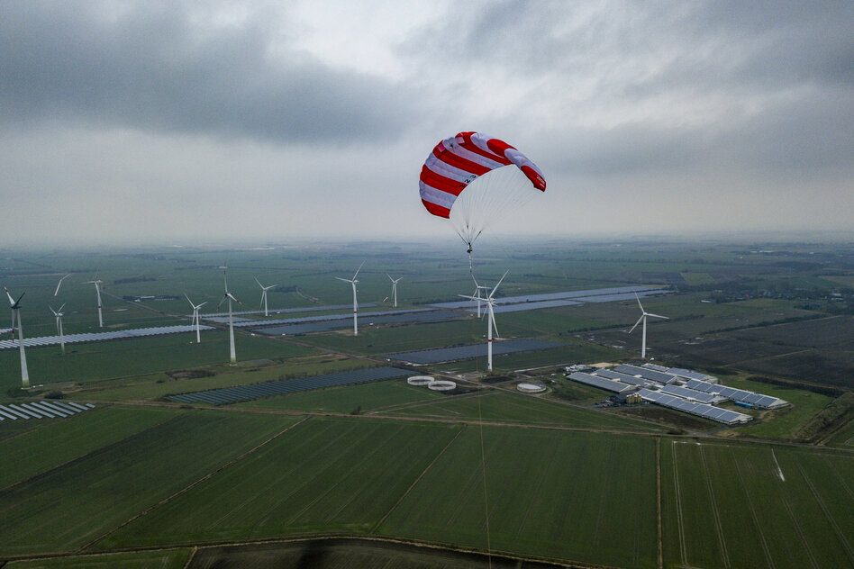 sparen. Der Drachen wird von einem Kranarm ausgebracht, entfaltet sich im