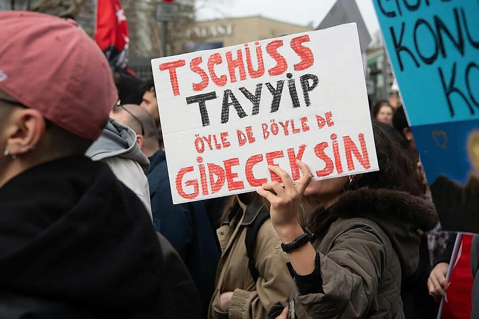 (IMG) Bild: „Tschüss Tayyip, so oder so wirst du gehen“, steht auf einem Demoschild bei einer Kundgebung des CHP Bund Berlin