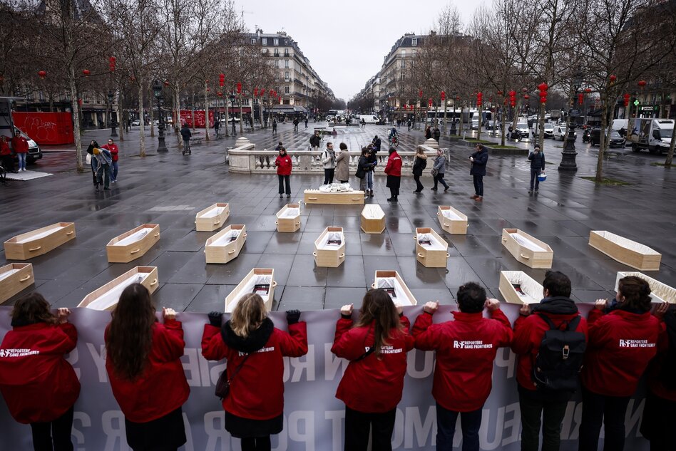 (IMG) Bild: Mitglieder von Reporter ohne Grenzen bei einer Aktion für in Russland inhaftierte ukrainische Journalisten im Februar 2025
