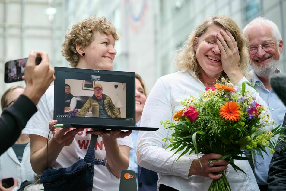 (IMG) Bild: Anwältin Roda Verheyen (r) freut sich nach der Urteilsverkündung. Kläger Saúl Luciano Lliuya ist per Video dazugeschaltet