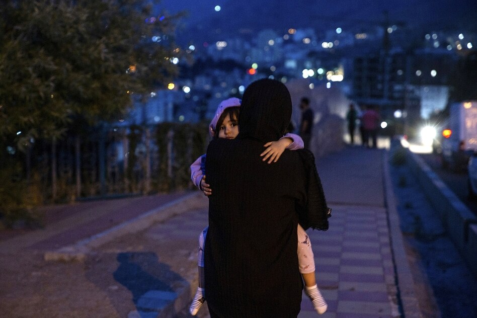 (IMG) Bild: Flucht, aber wohin? Eine Frau trägt nach israelischen Raketenangriffen ein Kind durch das nächtliche Teheran, 13. Juni