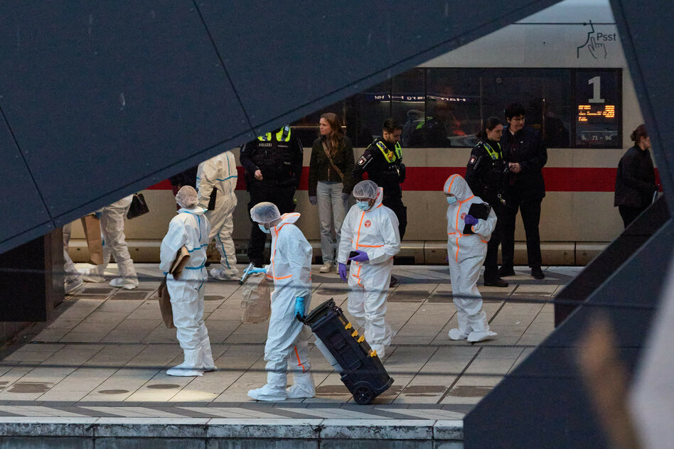 (IMG) Bild: Polizisten sichern Spuren nach dem Messerangriff im Hamburger Hauptbahnhof