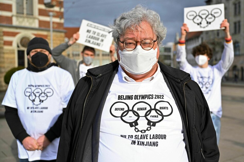 (IMG) Bild: Reinhard Bütikofer bei einem Protest für Menschenrechte in China im Jahr 2022. Damals war er Mitglied des Europäischen Parlaments