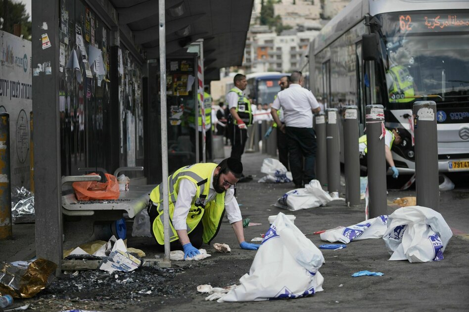 (IMG) Bild: Anschlag in Jerusalem an einer Bushaltestelle. Ein Mitglied der israelischen Rettungs- und Bergungskräfte reinigt den Tatort