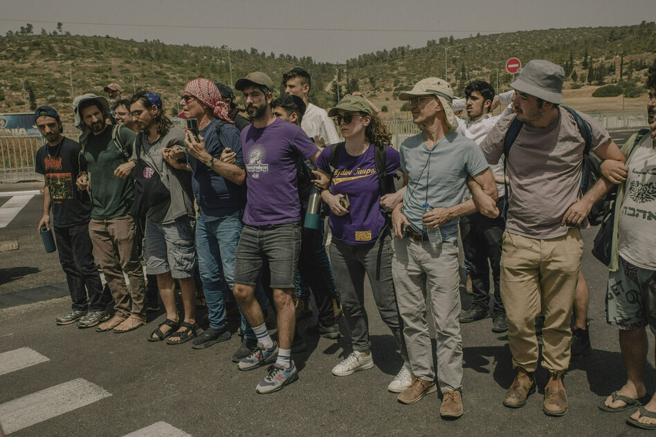 (IMG) Bild: Israelische Akti vis t:in nen haken sich unter, um Siedler im Mai 2024 davon abzuhalten, Hilfslieferungen nach Gaza zu blockieren
