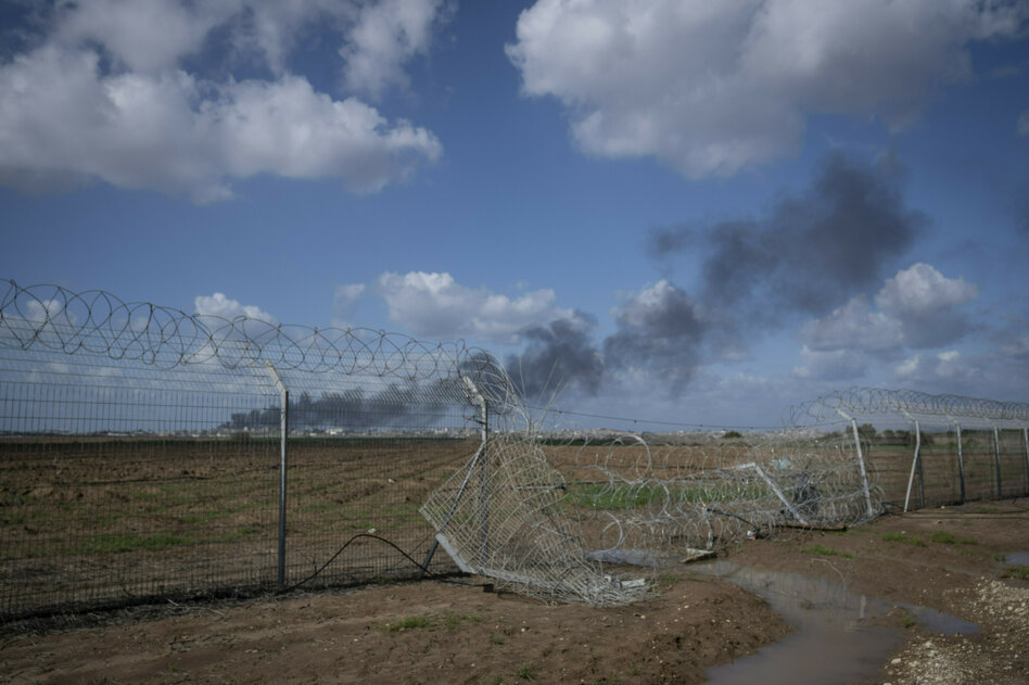 (IMG) Bild: Aufnahme eines von der Hamas durchbrochenen Zauns nahe Nahal Oz. Im Hintergrund Rauchsäulen im Gazastreifen. 30. Januar 2024