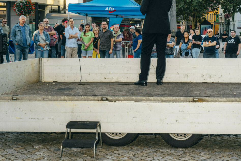 (IMG) Bild: Wird viel besprochen, aber nicht immer gewählt. Die AfD, hier bei einer Veranstaltung in Senftenberg 2024