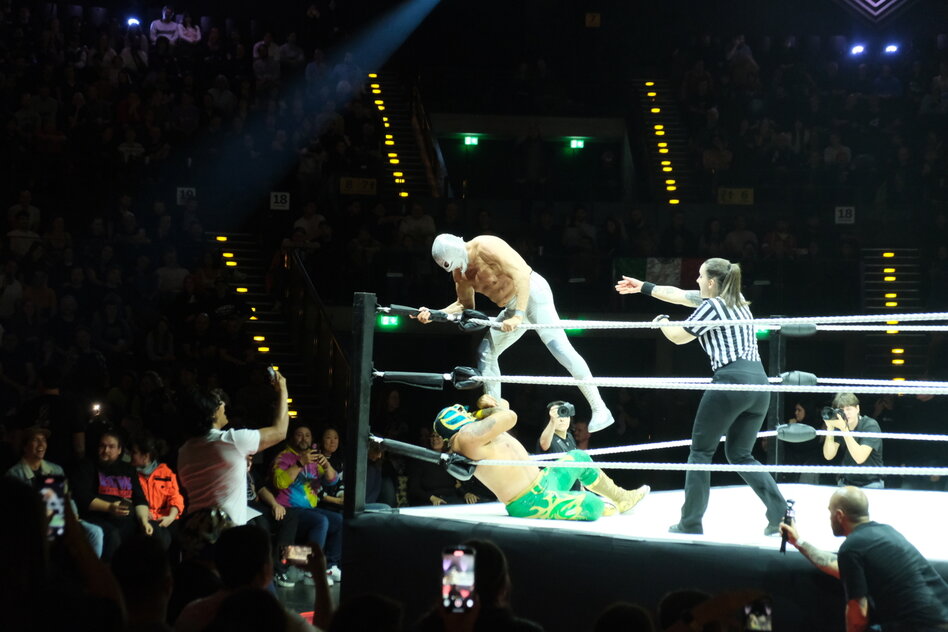 weiter mit zwei gegen zwei: Der Ringsprecher ist plötzlich der Luchador