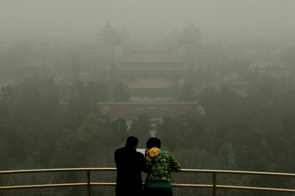(IMG) Bild: Trübe Aussichten: Touristen besuchen den Jingshan-Hügel vor der Verbotenen Stadt, während Smog über Peking liegt