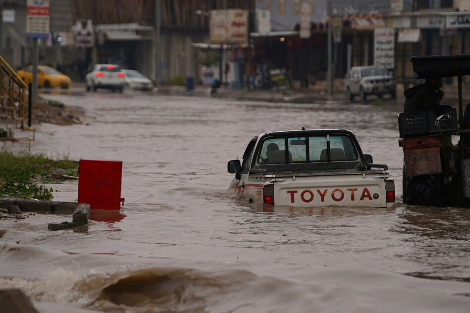 (IMG) Bild: Ein Kleintransporter steckt nach starken Regenfällen auf einer überfluteten Straße in der irakischen Stadt Mosul fest