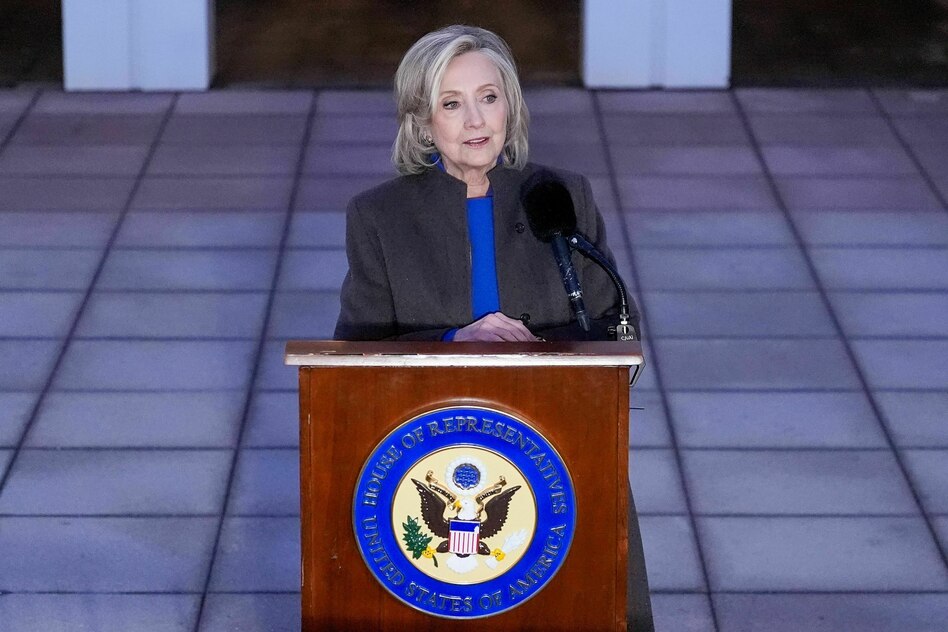 (IMG) Bild: Hillary Clinton spricht zur Presse, nachdem sie vor Abgeordneten des US-Repräsentantenhauses über Epstein ausgesagt hat