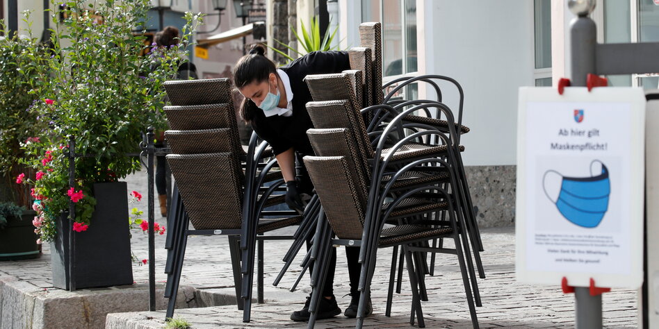 (IMG) Bild: Berchtesgaden vor dem Lockdown: Auf den Außenterrassen bauen Gastronomen ihre Stühle ab