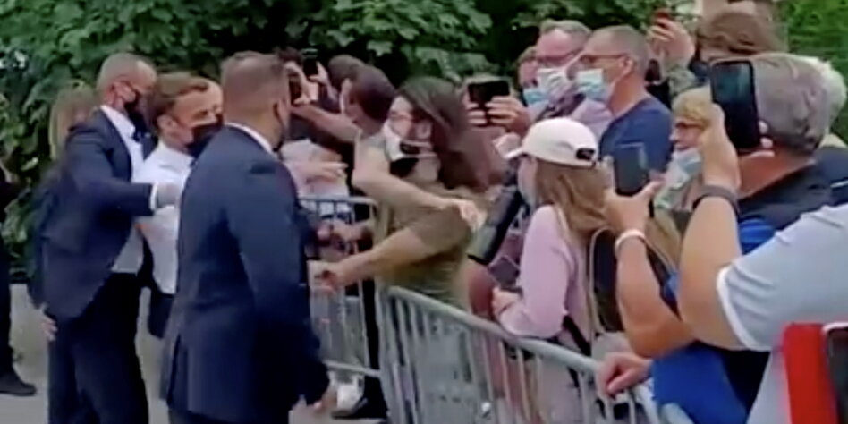 > Der französische Staatspräsident Emmanuel Macron wurde geohrfeigt. Kein