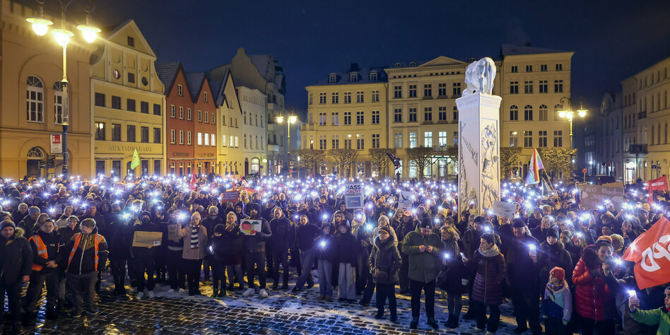 (IMG) Bild: Breites Bündnis gegen die AFD in Schwerin: Lichtermeer auf dem Marktplatz