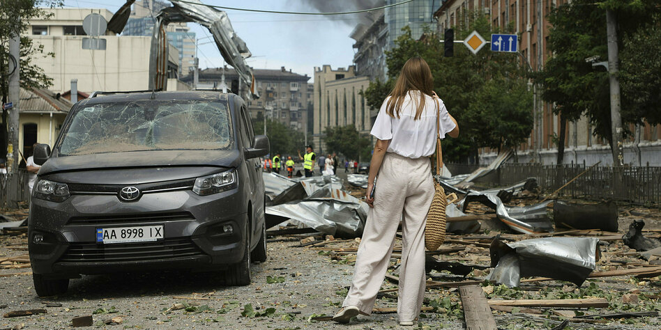 (IMG) Bild: Trauriger Kriegsalltag: Eine Frau macht Fotos von den Spuren eines russischen Raketenangriffs in Kyjiw am Montag