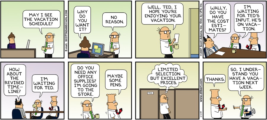 the cost estimates?" "I'm waiting for Ted's input. He's on vacation."