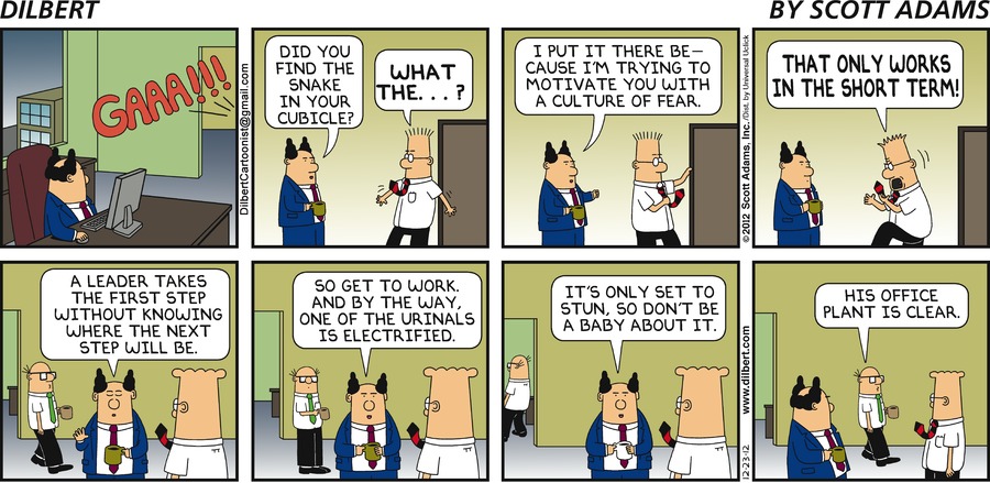 Dilbert: Gaaa!!! Boss: Did you find the snake in your cubicle?