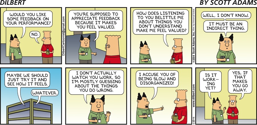 Boss: Would you like some feedback on your performance? Dilbert: No.