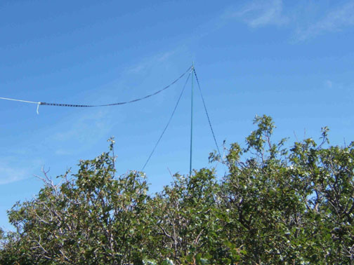 supported by a 32 ft. telescoping fiberglass pole lashed to a small tree