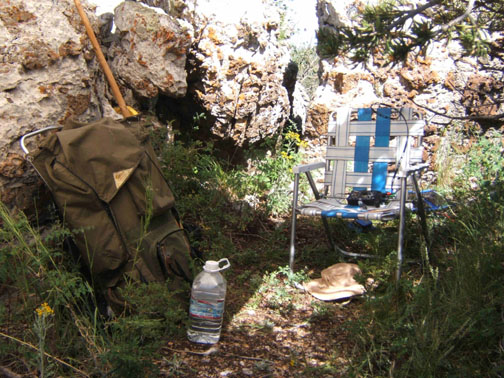 in the limestone just below the ridgeline to the west, with a tarp