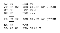 A2 00 LDX #0 20 3E x2 JSR $123E or $D23E C9 2C CMP #$2C D0 0D BNE ... 20 3E x2 JSR $123E or $D23E B0 08 BCS ... 9D 70 01 STA $170,X
