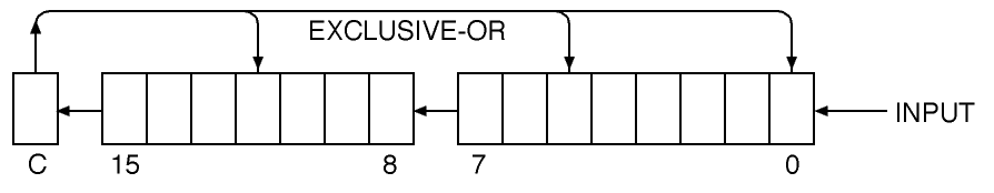 The 16-bit value is initialized to zero. Then each bit in the data buffer is presented one at a time where the input arrow is. The bits in the 16-bit value are all shifted left one position, and the new data bit comes in the right end to become the new bit 0. The bit which shifts out the left end is Exclusive-ORed with the bits now found in bits 12, 5, and 0. That is, if the bit shifted out was a zero, nothing happens. If the bit shifted out was a one, exclusive or the 16 bit value with $1021.